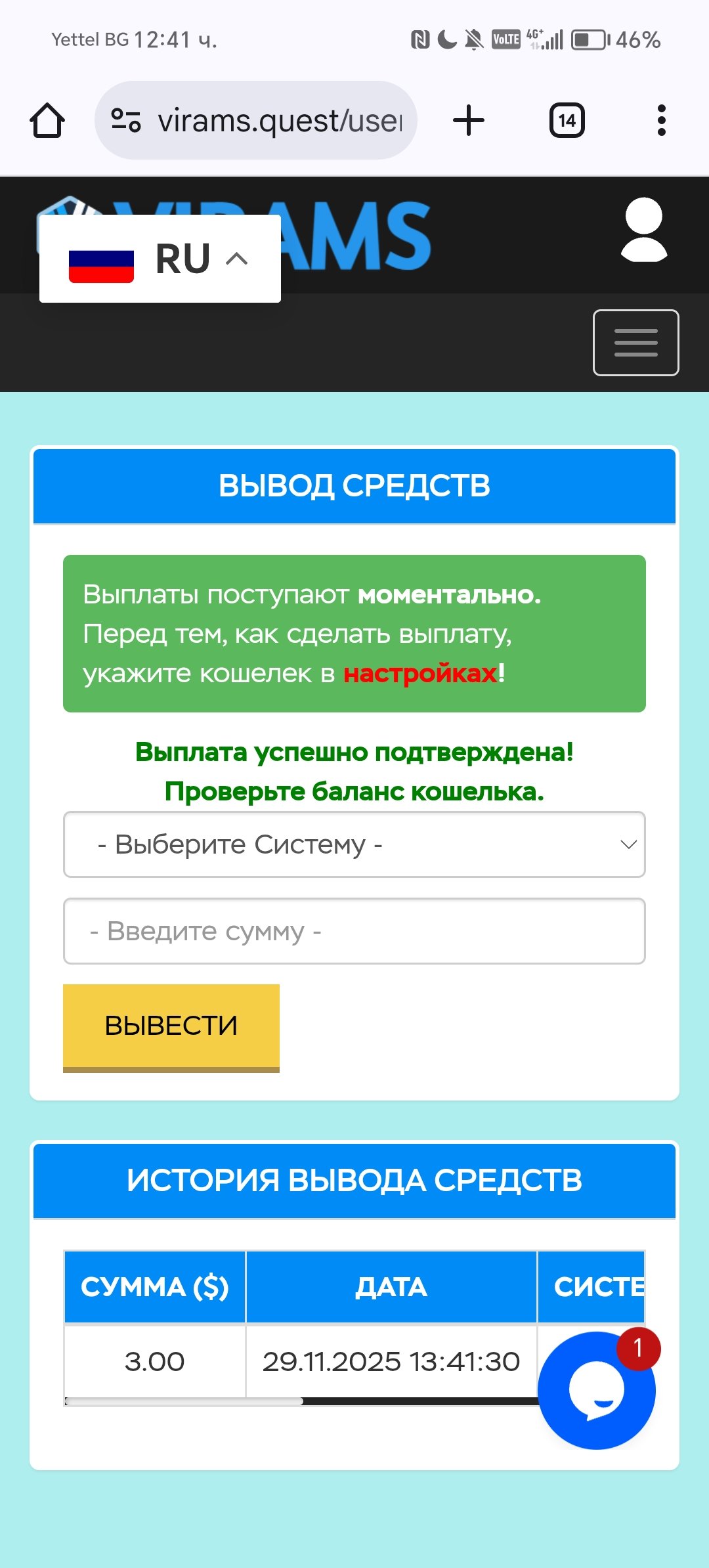 RG74 Posted 28 Nov 2025, 13:13 Posted 28 Nov 2025, 13:13 (edited) Минимальный депозит от 2$ Моментальные выплаты от 0,5$ +50% к вашему вкладу за 24 ч Я внес депозит, результат опобликую через 24 часа. Депозит: https://live.blockcypher.com/ltc/tx/461fddc0c34a328e59d42040aebb87c8787af71e0c7d1e3b2e41ff3790925724/ реферальная ссьiлка: https://virams.quest/?ref=Rosen74 Edited 28 Nov 2025, 15:35 by RG74