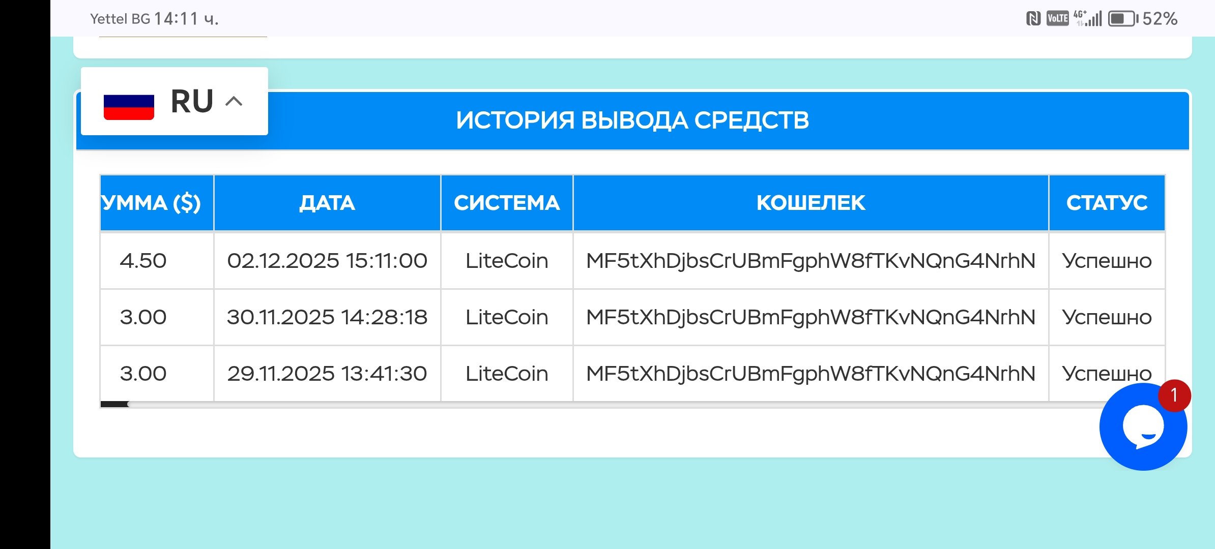 RG74 Posted 30 Nov 2025, 12:10 Author Posted 30 Nov 2025, 12:10 (edited) Вторая выплата: https://live.blockcypher.com/ltc/tx/55f5e3afac45c284734746d14ba9aed4bc986afda7257bd7b952b12850bff9cc/ Нов вклад : https://live.blockcypher.com/ltc/tx/a4c696e85345bb7bd519ef742e071b98901ade419521a87de3c04cb0bb478deb/ Edited 30 Nov 2025, 12:13 by RG74