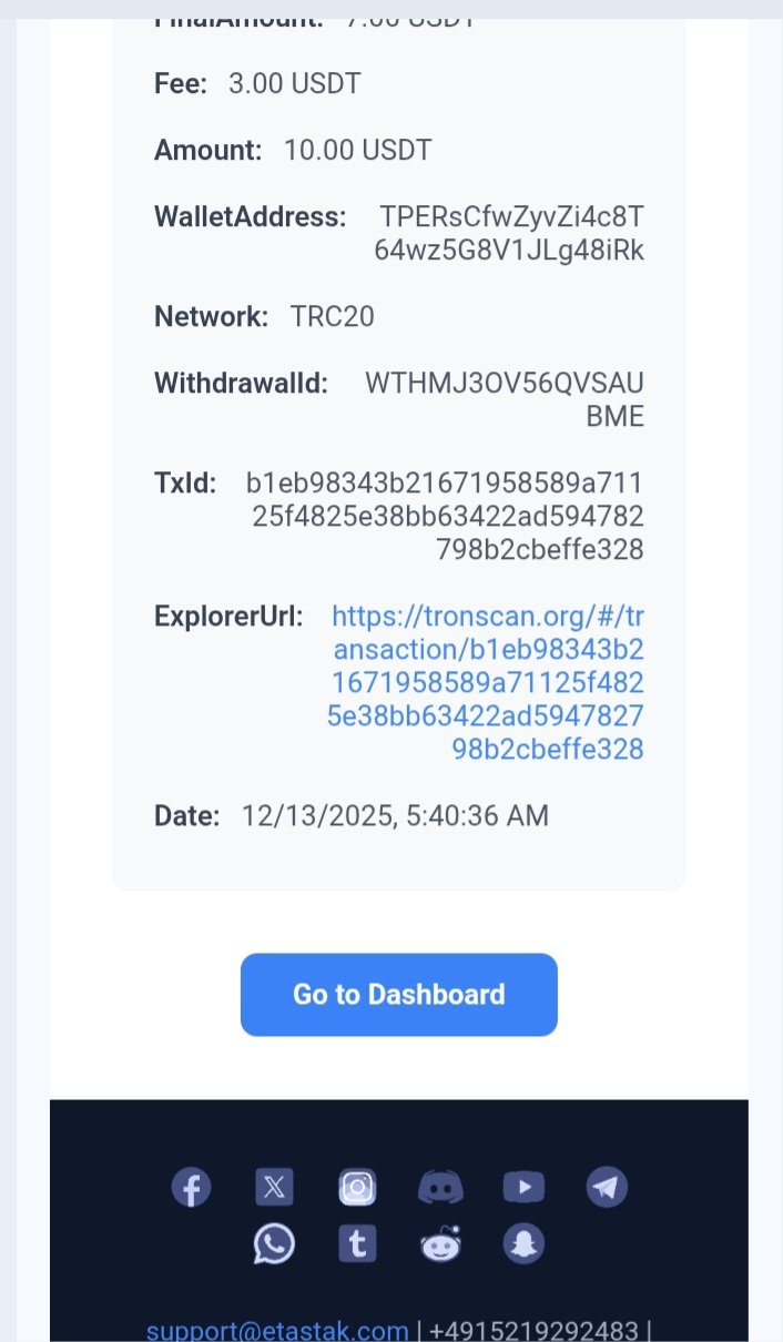 hyipownercom Posted 13 Dec 2025, 16:25 Posted 13 Dec 2025, 16:25 Very Fast Received withdrawal payment instantly etastak com 100% legit trusted Block & Time:78310644 2025-12-13 08:47:27 (Local) FinalAmount:7.00 USDT Fee:3.00 USDT Amount:10.00 USDT WalletAddress:TPERsCfwZyvZi4c8T64wz5G8V1JLg48iRk Network:TRC20 WithdrawalId:WTHMJ3OV56QVSAUBME TxId:b1eb98343b21671958589a71125f4825e38bb63422ad594782798b2cbeffe328 From: etastak com to hyipowner .com Thank you dear sir.