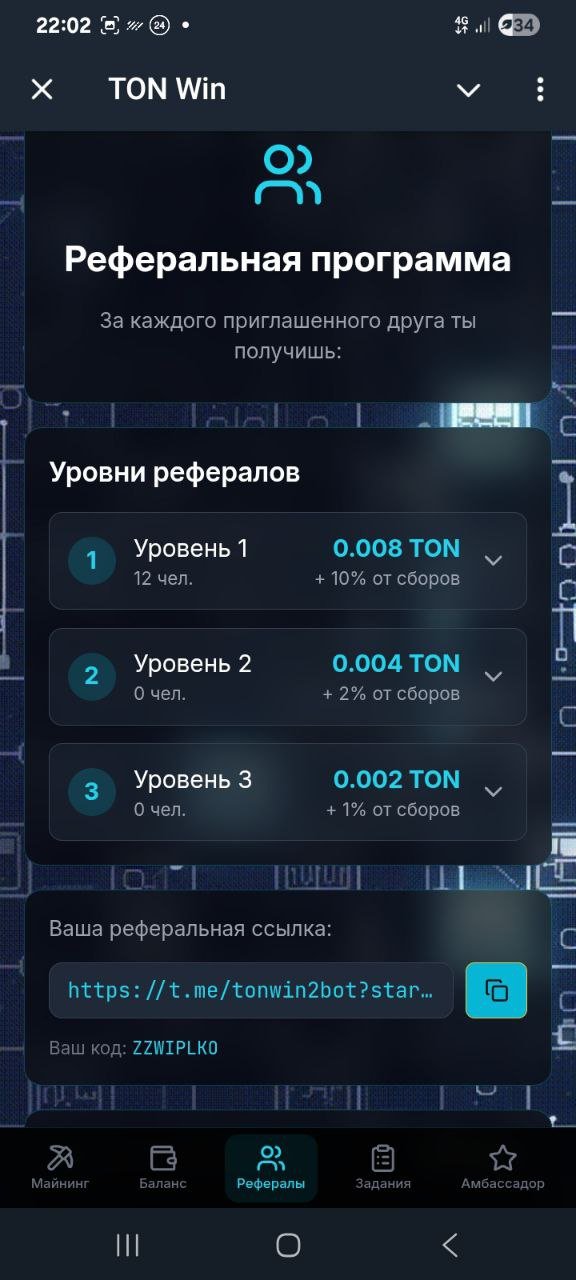 Goldenix Posted 12 Dec 2025, 20:04 Posted 12 Dec 2025, 20:04 Доброго времени суток. Представляю Вам псевдомайинг TONCOIN - https://t.me/tonwin2bot?start=ref_ZZWIPLKO Старт: 05.12.25 После регистрации вы получаете бесплатную мощность : Базовая скорость: 0.0000001 TON/5сек Можно ускорить: 0.4 TON или 40 Stars 0.8 TON или 80 Stars Реферальная система, три уровня: (+бонусы за приглашения) 1 уровень - 10 % 2 уровень - 2% 3 уровень - 1 % Минимум на вывод: 0.4 TON