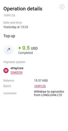 SQMonitor Posted 16 Oct 2022, 12:13 Posted 16 Oct 2022, 12:13 ePayCore: Date and time 14/10/2022 at 17:26 Top-up + 0.3 usd Payment system ePayCore E040239 Batch 1065611 Comment Withdraw to sqmonitor from LONGLOAN.
