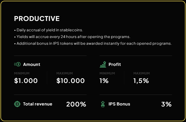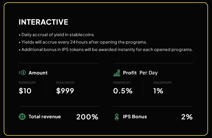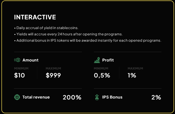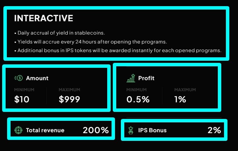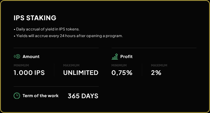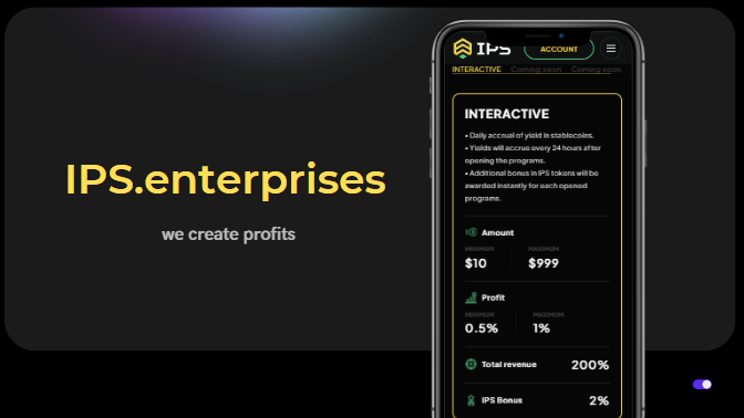 VikiCat Posted 2 Sep 2022, 10:57 Author Posted 2 Sep 2022, 10:57 Регистрируемся, открываем депозиты от 10 долларов и получаем прибыль каждый день. Получаем токены IPS в качестве бонуса, увеличиваем их, продаем по более высокой цене. Зарабатываем вместе с IPS ENTERPRISES