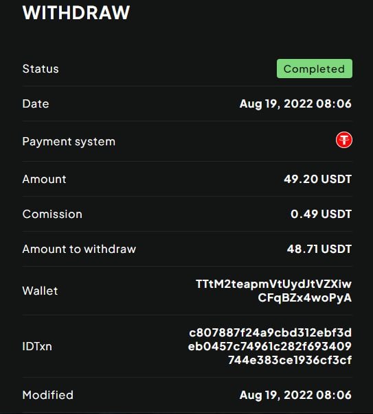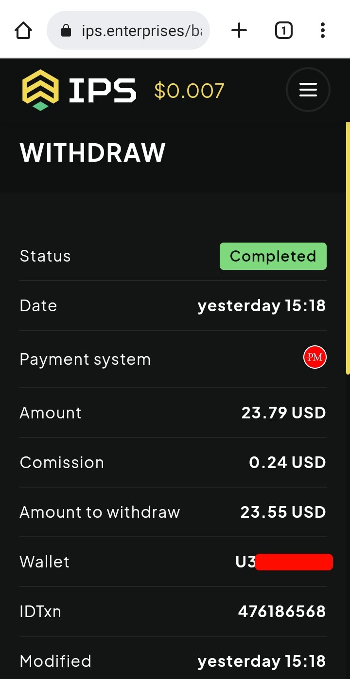 VikiCat Posted 10 Aug 2022, 16:21 Author Posted 10 Aug 2022, 16:21 10 Августа прибыль в IPS ENTERPRISES составила 1% в USDT.... Также пришла выплата прибыли и реферальных. Стабильно всё работает