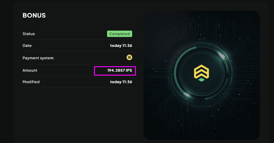 VikiCat Posted 16 Aug 2022, 11:44 Author Posted 16 Aug 2022, 11:44 Открыла ещё один небольшой депозит. С каждого депозита мы дополнительно бонусом получаем Токены IPS от компании. На данный момент цена первоначальная на Токен и составляет 0.007 USD...