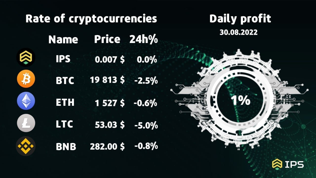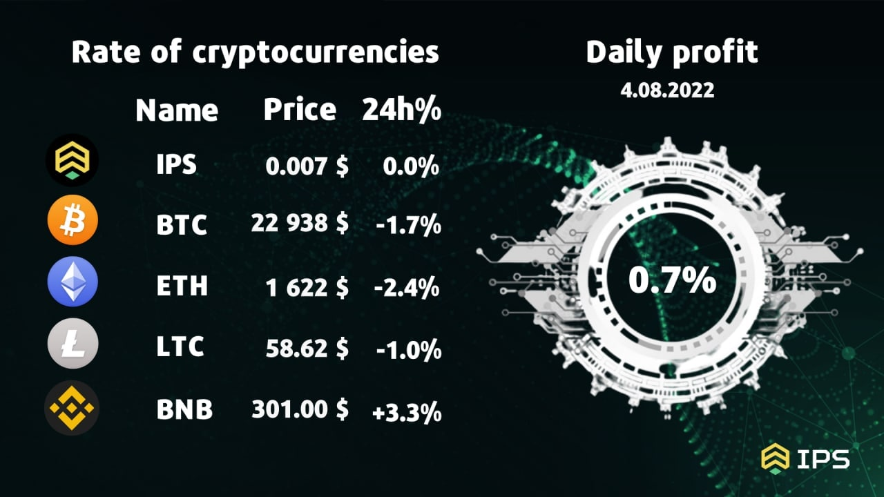 VikiCat Posted 4 Aug 2022, 06:15 Author Posted 4 Aug 2022, 06:15 3 августа - прибыль в ips enterprises составила 1% в USDT