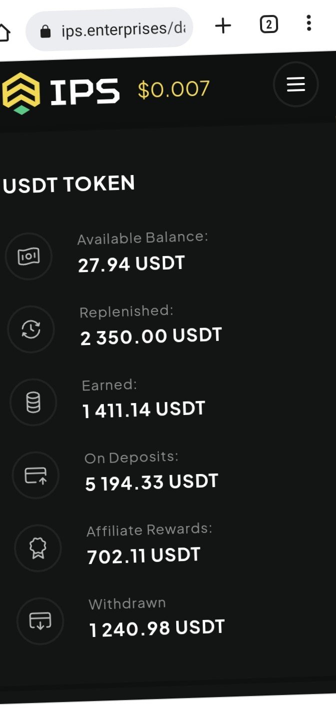DmCrypto Posted 8 Sep 2022, 07:05 Posted 8 Sep 2022, 07:05 My result in two months at IPS ENTERPRISES: Added a total of $2,350 to my account. Withdrew $1,240 in profits. I have 5194 dollars in deposits. On the affiliate program I received 702 dollars bonus. Top platform for stable profits in USDT??? Sign up- invest from $10 and get up to 30% profit per month in USDT???... Мой результат за два месяца в IPS ENTERPRISES: Пополнил свой кабинет в общей сумме на 2350 долларов. Вывел прибыли 1240 долларов. На депозитах у меня 5194 доллара. По партнёрской программе я получил 702 доллара премии. ТОП платформа для стабильного получения прибыли в USDT??? Регистрируйся- инвестируй от 10 долларов и получай до 30% прибыли в месяц в USDT???