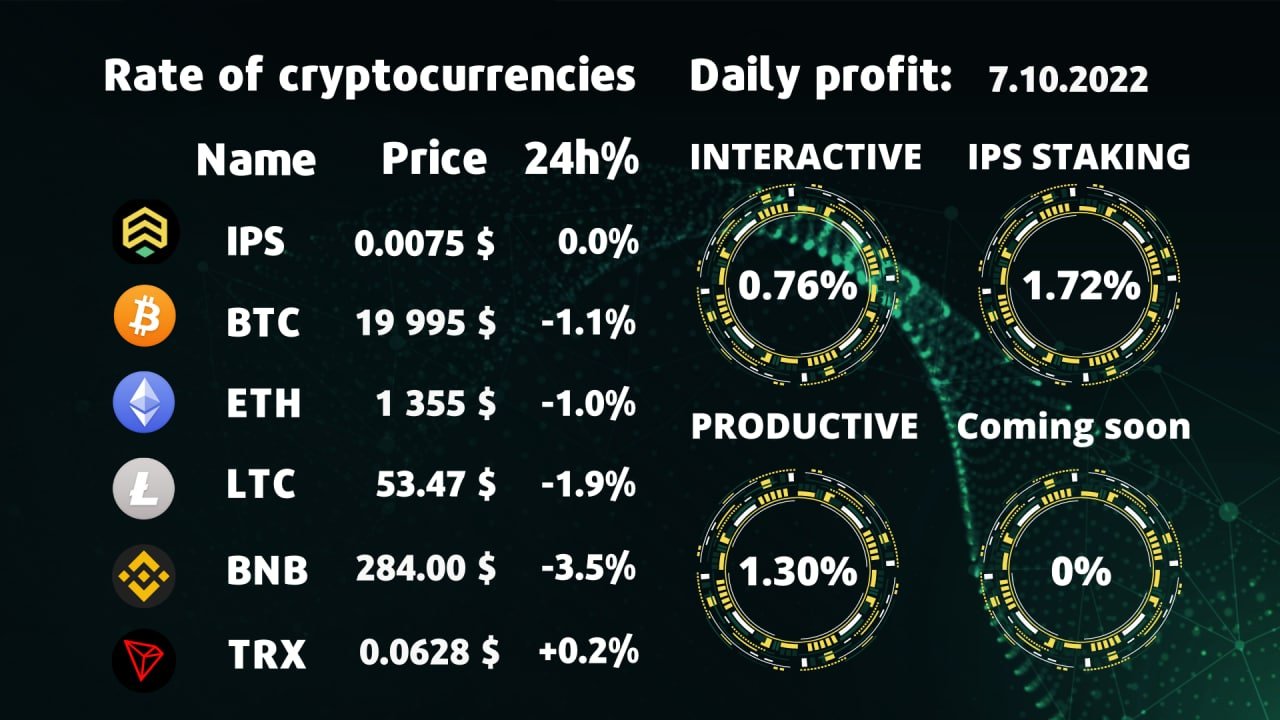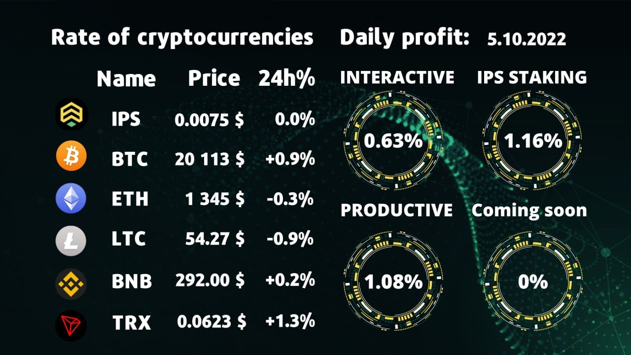 DmCrypto Posted 7 Oct 2022, 06:44 Posted 7 Oct 2022, 06:44 На платформе открылся второй тарифный план с ежедневным начислением прибыли от 1% до 1.5%. Депозиты от 1000 до 10000 долларов. С каждого открытого депозита мы получаем бонус в Токенах IPS ( 2-3% ) от суммы вклада. Цена токена изначально была 0.007$... Каждый месяц Токен растёт в цене, текущий курс 0.0075$... Каждый месяц 1-го числа мы можем продать Токен на платформе. Также можно открыть программу Staking на 365 дней, где ежедневно получаем Токены от 0.75% до 2% от нашего количества монет...