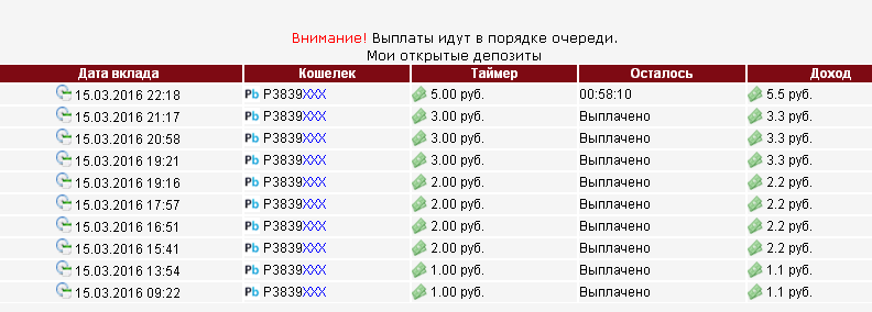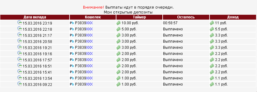 Tolik_87 Posted 16 Mar 2016, 10:55 Posted 16 Mar 2016, 10:55 (edited) Дата вклада Кошелек Таймер Осталось Доход16.03.2016 10:51 P24891XXX 7.00 руб. 05:58:15 7.7 руб. Edited 16 Mar 2016, 10:59 by Tolik_87