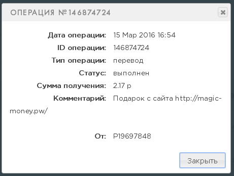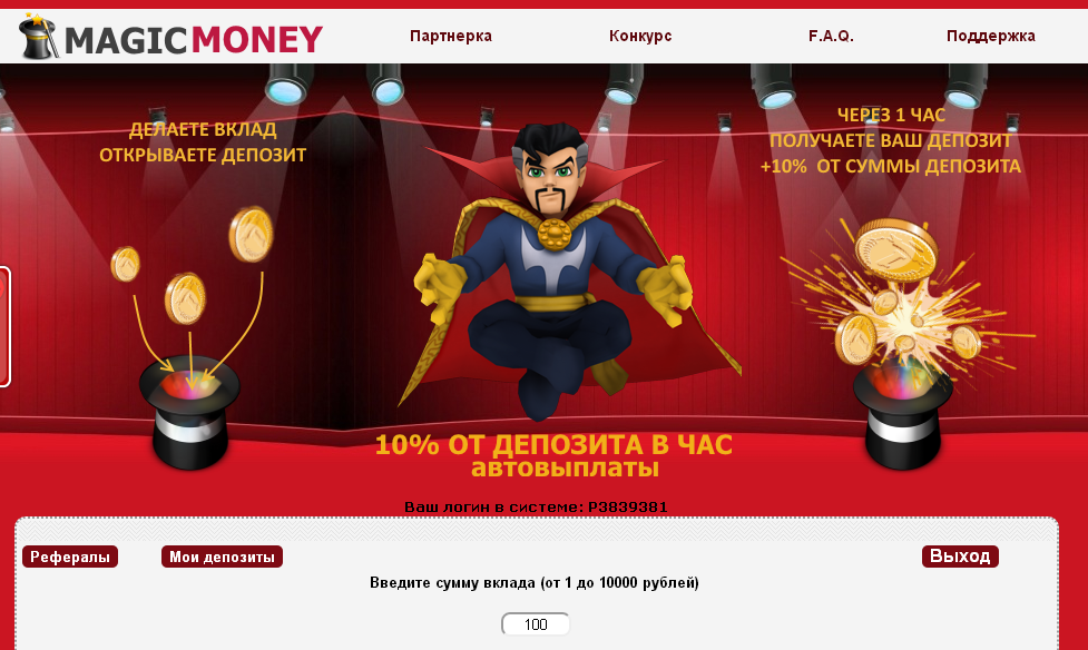 Fialka Posted 15 Mar 2016, 10:19 Posted 15 Mar 2016, 10:19 Вот интересная шняга работает, решил с Вами поделиться об этом проекте. Суть такая, депаешь от 1 рубля и больше и через час получаешь обратно свой деп и + 10%. На соседнем форуме отписались кто много депал, что не платят, но кто не много депал, все молчат, по ходу получают. Вот и я для пробы депнул 1 рублик и к удивлению получил 1.08. Ну и ещё разок депнул. Если у кого есть желание, можете испытать удачу, но, рекомендую по малой. Реф ссылка http://magic-money.pw/