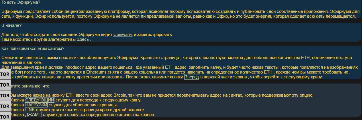 coin7612 Posted 29 Mar 2016, 20:23 Posted 29 Mar 2016, 20:23 Вот посмотрите ротатор Ethereum все рабочие краны http://coinrotator.net/ethrotator/ -ETHROTATOR (добавить в закладки) и список кранов (+2крана не работающих в ротаторе,но исправно платящие) http://coinrotator.net/ethrotator/list.php -FAUCET LIST (добавить в закладки) страницу со списком кранов можно открыть и из ротатора (1.в правом верхнем углу жмём на меню, 2.в левой части выбираем список кранов