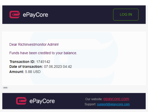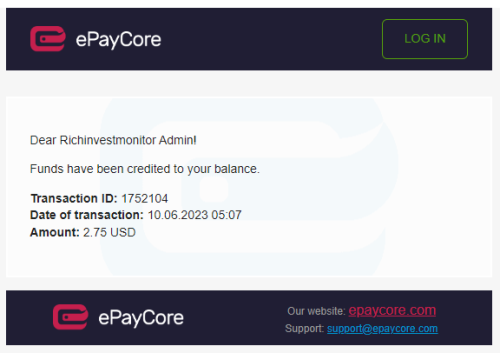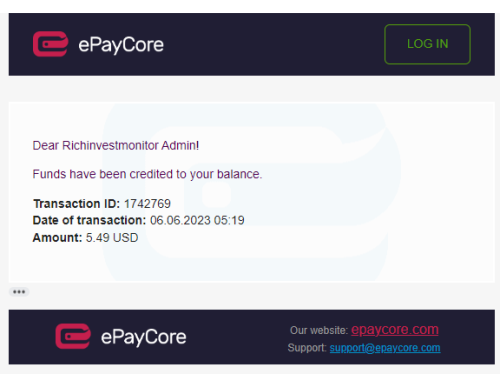 mixpepper22 Posted 3 Jan 2023, 21:52 Author Posted 3 Jan 2023, 21:52 Date and time Yesterday at 19:56 + 2.94 USD ePayCore E042471 Batch 1293927 -------------------------------- The amount of 2.75 USD has been deposited to your account. Accounts: U37410452->U2927216. Memo: Withdraw to richinvestmonitor from xenium.pro. Date: 11:30 03.01.23. Batch: 499685014.
