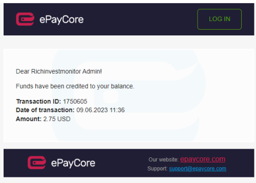 mixpepper22 Posted 1 Jan 2023, 15:40 Author Posted 1 Jan 2023, 15:40 Date and time Today at 9:18 + 2.94 USD ePayCore E042471 Batch 1288653 ------------------------ The amount of 2.75 USD has been deposited to your account. Accounts: U37410452->U2927216. Memo: Withdraw to richinvestmonitor from xenium.pro. Date: 11:25 01.01.23. Batch: 498893040.