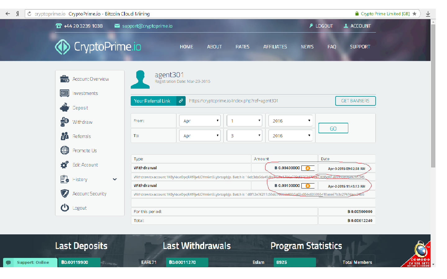 agent301 Posted 2 Apr 2016, 07:35 Posted 2 Apr 2016, 07:35 (edited) Инвестиционный проект. Минимальный депозит от 0.001 BTC. Доходность по инвестиционным планам 0.14% - 0.20% в час. В зависимости от депозита Вывод депозита в любое время с комиссией 4% (FEE) Мгновенная выплата на биткоин кошелёк ваших % от одного сатоши. Методы пополнения и вывода: Bitcoin. Лично выводил заработанные % и деп. Вложил заново, вот скрин: Ссылка для регистрации - https://cryptoprime.io/index.php?ref=agent301 Edited 24 Apr 2016, 20:06 by agent301