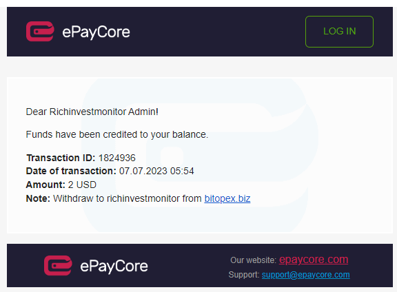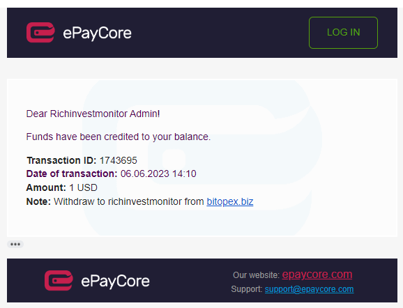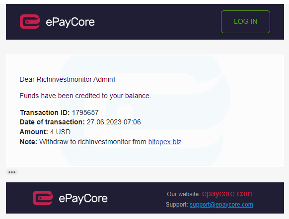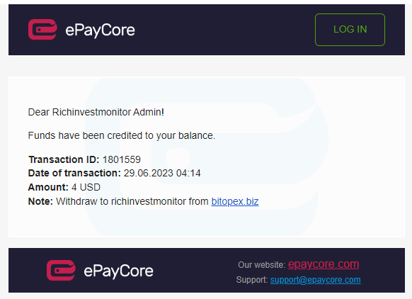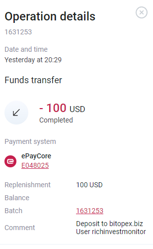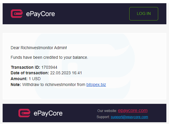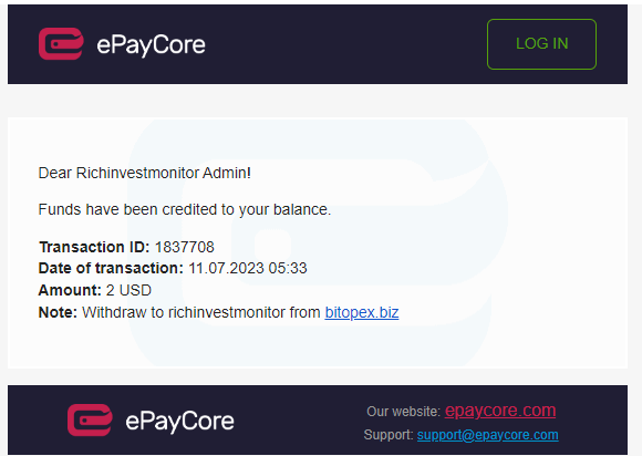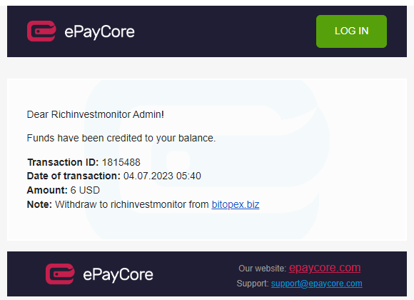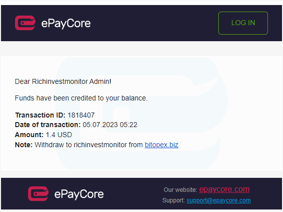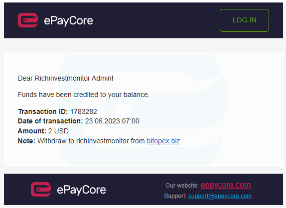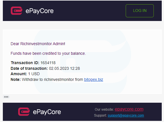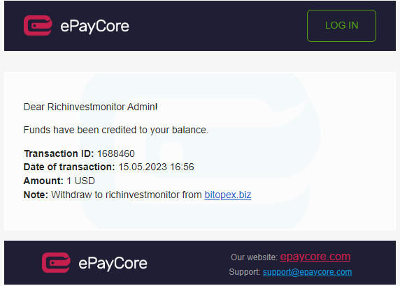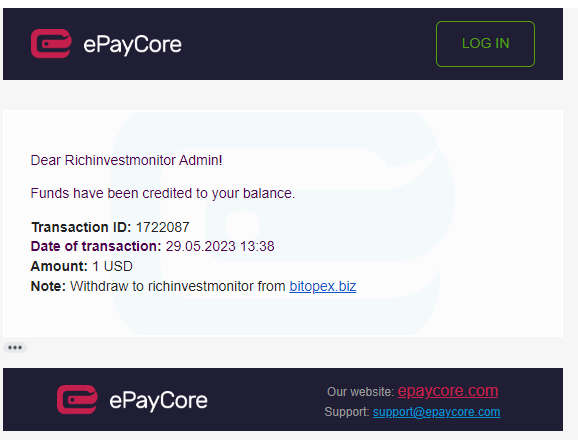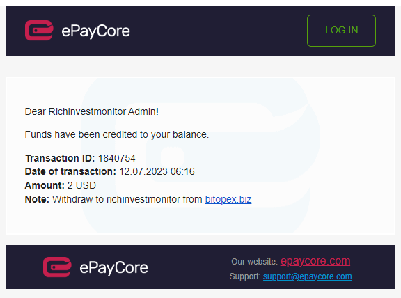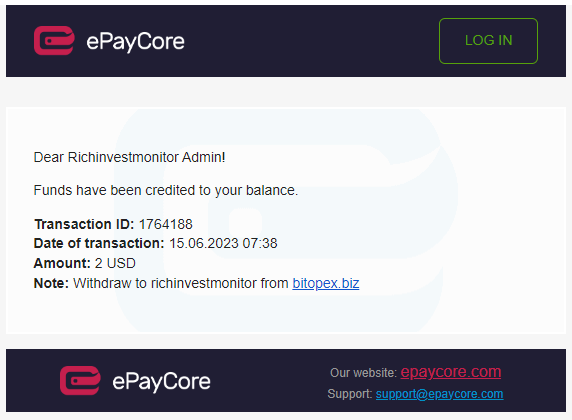 mixpepper22 Posted 16 Jun 2023, 12:16 Author Posted 16 Jun 2023, 12:16 (edited) Transaction ID: 1764188 Date of transaction: 15.06.2023 07:38 ePayCore E048025 Amount: 2 USD Note: Withdraw to richinvestmonitor from bitopex.biz Edited 16 Jun 2023, 12:18 by mixpepper22