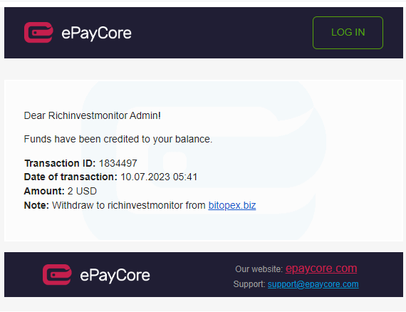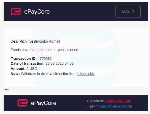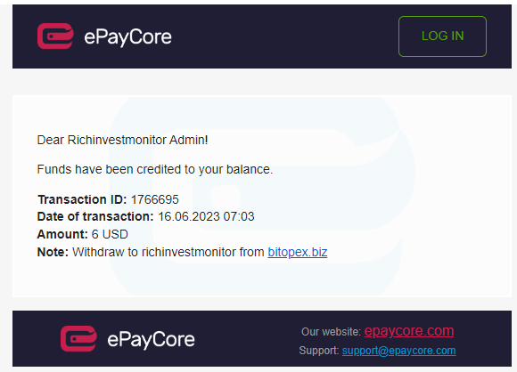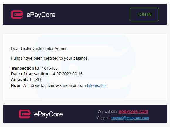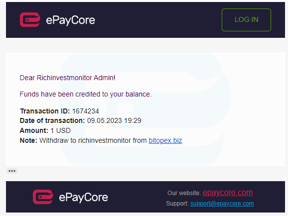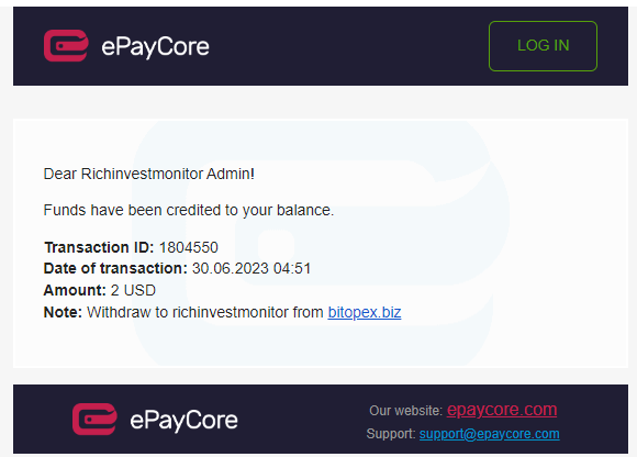 mixpepper22 Posted 25 Apr 2023, 05:17 Posted 25 Apr 2023, 05:17 (edited) Я не админ проекта, админа не знаю! Вся информация взята с сайта проекта. Тема создана с целью информирования и не является призывом к действию. Цитата Добро пожаловать в нашу современную компанию для амбициозных инвесторов! BITOPEX — это инвестиционная компания, которая помогает своим членам находить перспективные цифровые активы и успешно финансировать их посредством частных транзакций. Компания BITOPEX полностью легальна и зарегистрирована в Великобритании - номер компании 14825871. Мы инвестируем в акции стабильных и быстрорастущих компаний на рынке цифровых активов. Приоритетным направлением являются компании, разрабатывающие решения для финансовых операций с использованием технологии блокчейн, а также решения для автоматизированной торговли на бирже. Здесь вы найдете самые актуальные предложения для наиболее выгодных и перспективных инвестиций. Мы даем вам финансовую свободу Мы одна из самых полезных и популярных инвестиционных компаний для тех, кто ищет профессиональную помощь в финансовом планировании и управлении своими финансами. BITOPEX — лучшее решение для современных и стабильных инвестиций. Мы предлагаем все, что вам может понадобиться, связанное с инвестированием. Мы много работаем над нашей компанией и тратим много времени на то, чтобы стать надежной программой. Учтите, что это эксклюзив: вам нужно получить специальное членство для доступа к BITOPEX. Старт Apr 24, 2023 Дата переодевания, смены планов и т.д. Jun 12, 2023 Планы: Цитата 2.0% daily for 15 business days Plan Spent Amount ($) Daily Profit (%) Plan 1 20.00 - 50000.00 2.00% 2.5% daily for 20 business days Plan Spent Amount ($) Daily Profit (%) Plan 1 49999.00 - 50000.00 2.50% 3.0% daily for 30 business days Plan Spent Amount ($) Daily Profit (%) Plan 1 49999.00 - 50000.00 3.00% 250% after 35 business days Plan Spent Amount ($) Profit (%) Plan 1 49999.00 - 50000.00 250.00% 400% after 50 business days Plan Spent Amount ($) Profit (%) Plan 1 49999.00 - 50000.00 400.00% 600% after 70 business days Plan Spent Amount ($) Profit (%) Plan 1 49999.00 - 50000.00 600.00% VIP 1 - 1500% after 10 business days Plan Spent Amount ($) Profit (%) Plan 1 99999.00 - 100000.00 1500.00% VIP 2 - 3000% after 30 business days Plan Spent Amount ($) Daily Profit (%) Plan 1 99999.00 - 100000.00 3000.00% VIP 1 - 6000% after 50 business days Plan Spent Amount ($) Profit (%) Plan 1 99999.00 - 100000.00 6000.00% -Принимают: ePayCore / Bitcoin / Litecoin / Ethereum / Tether ERC20 / Tron / Tether TRC20 / BNB / Tether BEP20 -ДДОС Защита - OVH -SSL GreenBar - EV SSL valid from 30 May, 2023 to 29 May, 2024 - DigiCert Inc -Реф программа: 0.5% -193.70.107.94 is hosted on a dedicated server -Уникальный дизайн -Лицензия ГК -Выплаты ручные Цитата NS1.COVER-DNS.NET (has 164 domains) NS2.COVER-DNS.NET (has 164 domains) Цитата Bitopex Company BITOPEX LIMITED UK company: #14825871 45 Southampton Way, London, England, SE5 7SW Цитата Check GoldCoders' HYIP Manager License bitopex.biz - Licensed РЕГИСТРАЦИЯ--->>>> Наш вклад: Edited 12 Jun 2023, 21:24 by mixpepper22