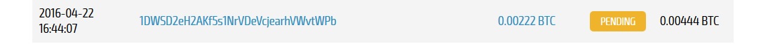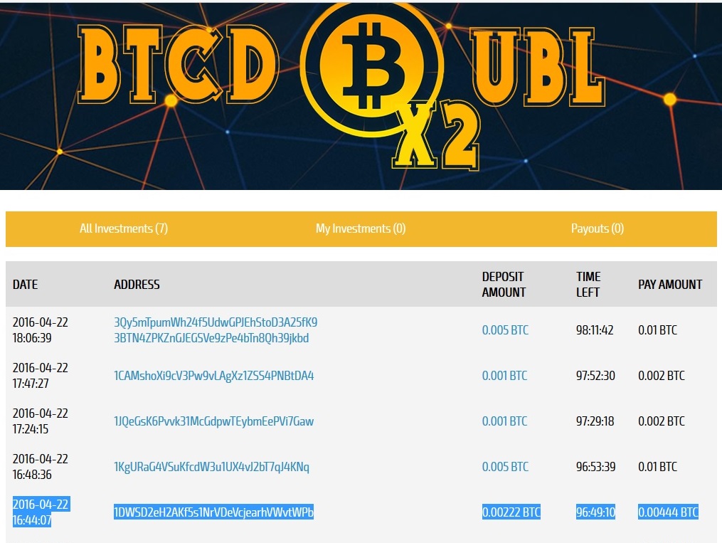 fulllamer Posted 22 Apr 2016, 16:57 Posted 22 Apr 2016, 16:57 (edited) http://btcdoubl.xyz/ref/571a546601118минимум вклад 0.001btcрефка 15%Деп лег, через 100 часов отпишу )2016-04-22 16:44:07 1DWSD2eH2AKf5s1NrVDeVcjearhVWvtWPb 0.00222 BTC 99:49:00 0.00444 BTCУже час висит в pending, на кошеле пока ничего нету. Edited 26 Apr 2016, 21:30 by fulllamer