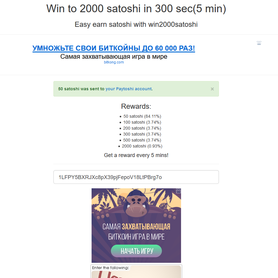 gydropool Posted 11 May 2016, 08:44 Posted 11 May 2016, 08:44 Кран win2000satoshi Награды: 50 satoshi (84.11%) 100 satoshi (3.74%) 200 satoshi (3.74%) 300 satoshi (3.74%) 500 satoshi (3.74%) 2000 satoshi (0.93%) Платит каждые 5 минут! Рефам по 30%! http://win2000satoshi.top/?r=1LFPY5BXRJXc8pX39pjFepoV18LtPBrg7o