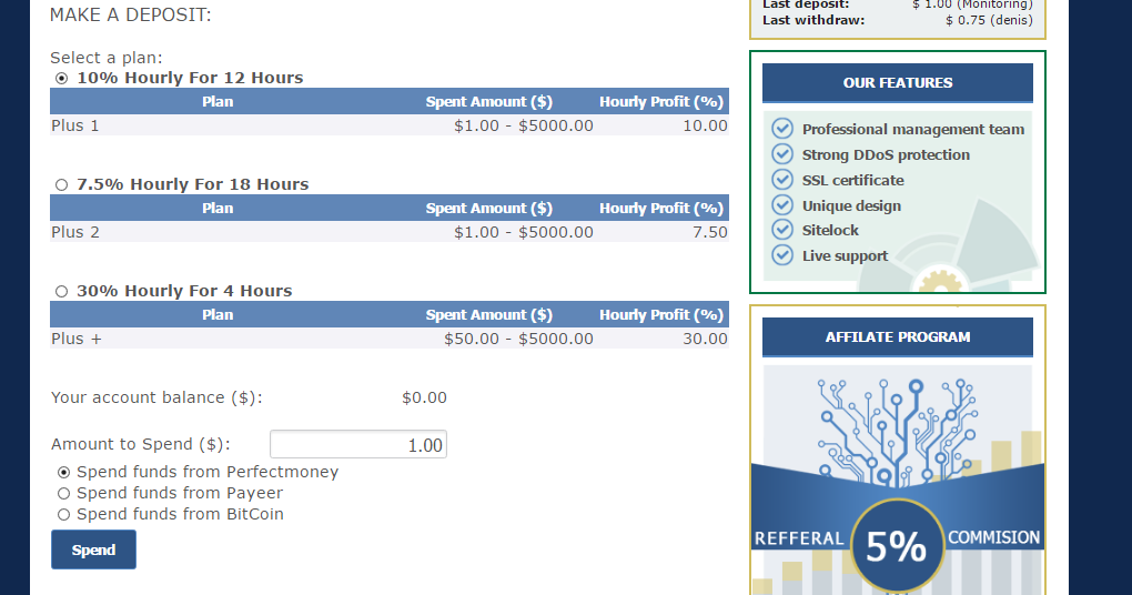 dvs777@mail.ru Posted 9 Jun 2016, 11:09 Posted 9 Jun 2016, 11:09 (edited) Старт проекта сегодня. Платёжные системы PerfectMoney.Payeer.Bitcoin. Минимальный депозит 1$ максимальный 5000$ Реф-5% Ссылка https://hourlyplus.com/?ref=Monitoring Мой депозит Transfer from external processings $ 1.00 Jun-9-2016 03:55:29 AM Add funds to account from Payeer. Batch id = 195558023 Edited 9 Jun 2016, 21:25 by bond77