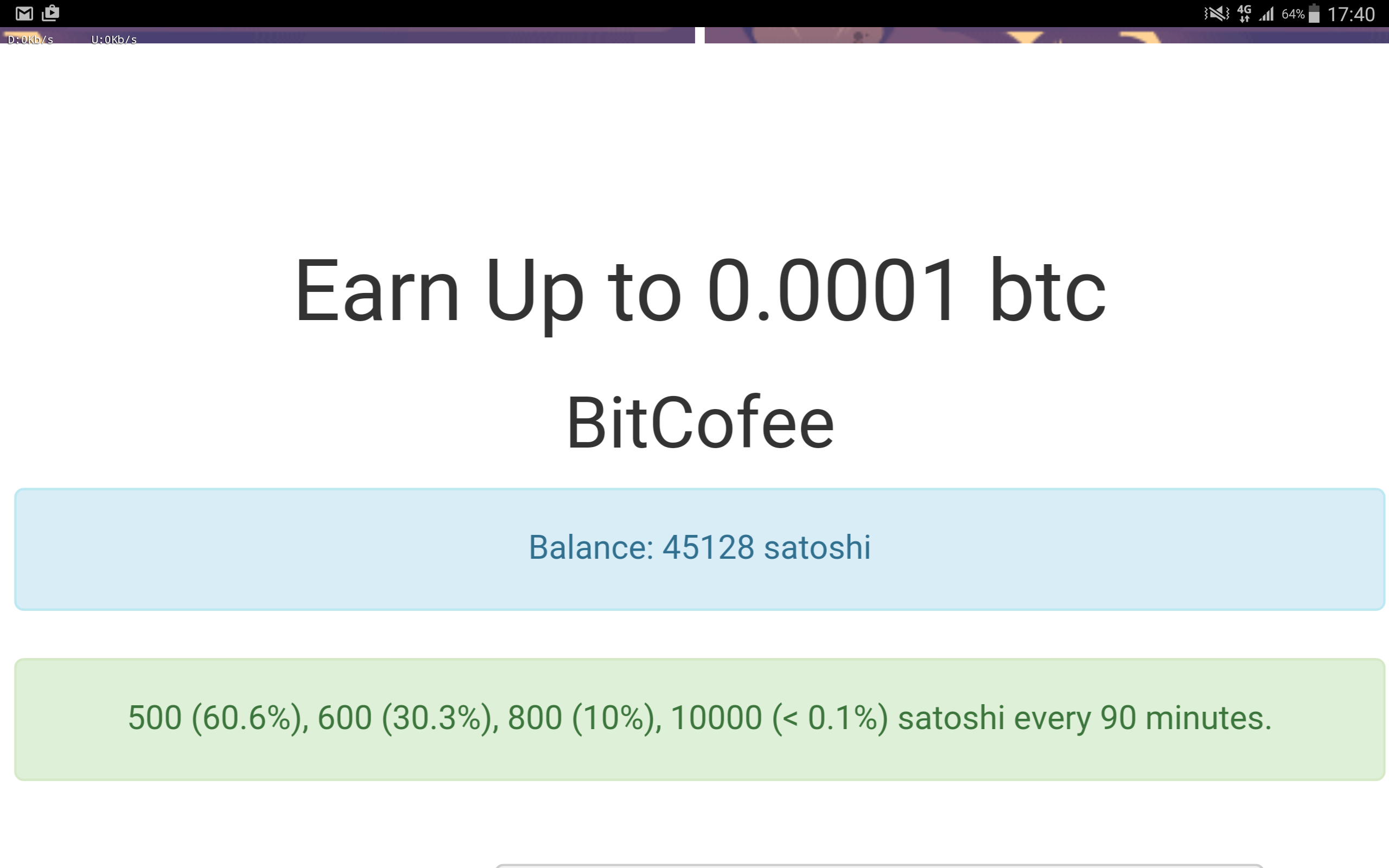 bitcofe.tk - 500 (60.6%), 600 (30.3%), 800 (10%), 10000 (< 0.1%) satoshi every 90 minutes