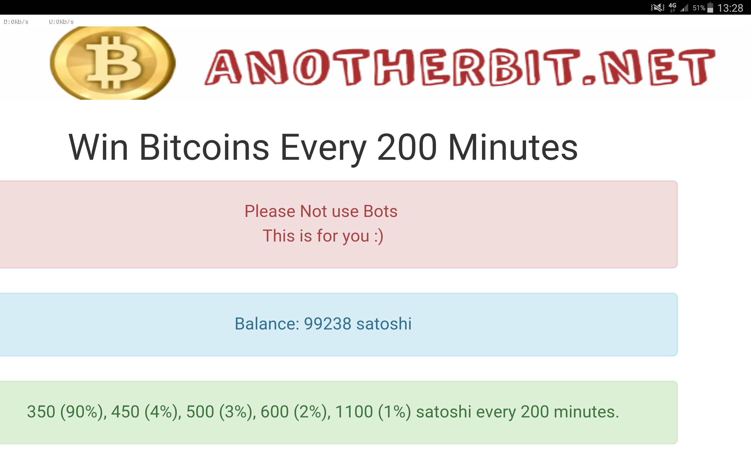 anotherbit.net - 400 (90%), 450 (4%), 550 (3%), 600 (2%), 1100 (1%) satoshi every 200 minutes.
