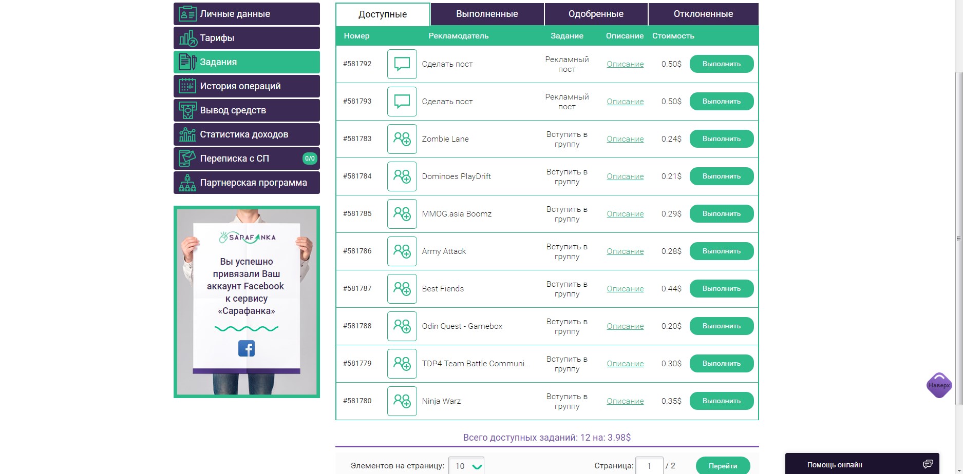 Tabidzee Posted 19 Aug 2016, 12:30 Posted 19 Aug 2016, 12:30 Новый сайт по заработку,все что вам нужно просто иметь аккаунт на facebook, за регистрацию дарят 5$ в виде заданий,они самые простые,поставить лайк,подписаться,вступить в группу,ниже покажу стоимость выполнения таких заданий! на сайте доступны тарифные планы,вы можете увеличить ваш заработок, для примера стоимость минимального тарифа 10$ и он доступен на 3 дня,ежедневно вы будете зарабатывать 7 $, а учитывая что 5 вам подарят,за 3 дня работы ваша прибыль составит 16$ что не так уж и плохо! но не обязательно даже покупать тариф,приглашайте рефералов, 5 уровневая реферальная программа! вывод доступен от 15$ на VISA MASTERCARD,ЯНДЕКС ДЕНЬГИ,И НА WEBMONEY ссылка на проект https://goo.gl/HYgmaF