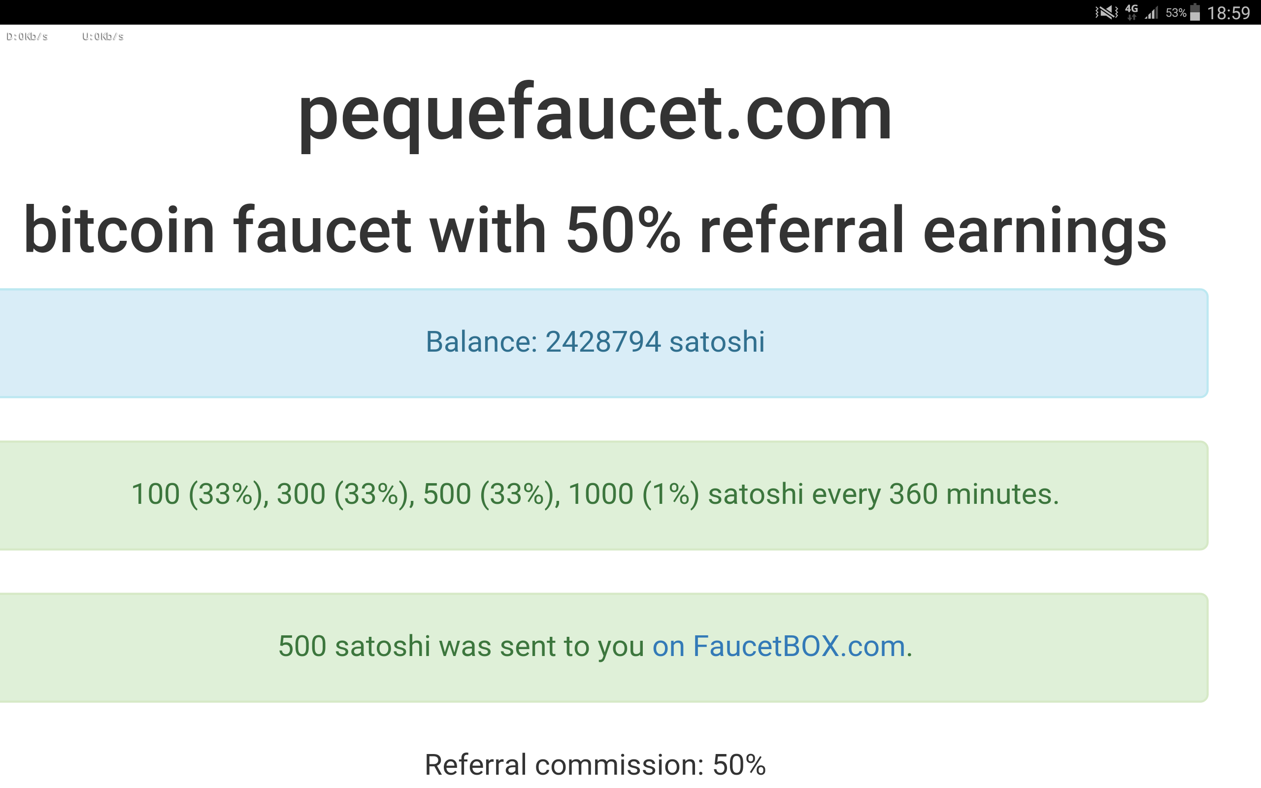 pequefaucet.com - 100 (33%), 300 (33%), 500 (33%), 1000 (1%) satoshi every 360 minutes.