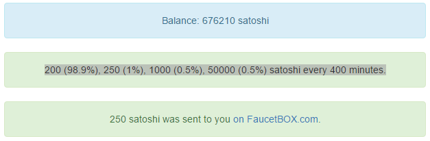 gold-bit.co 200 (98.9%), 250 (1%), 1000 (0.5%), 50000 (0.5%) satoshi every 400 minutes.