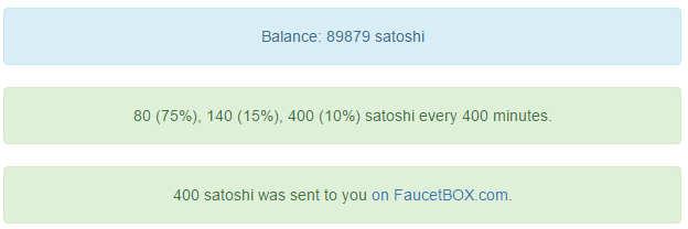 fleshka Posted 21 Sep 2016, 16:53 Posted 21 Sep 2016, 16:53 80 (75%), 140 (15%), 400 (10%) satoshi every 400 minutes. BitcoinDAA 400 satoshi 2016-09-21 19:49:31 EEST http://www.bitcoindaa.xyz/?r=1s5Z1FHeFDXGPCr454NmirW5ucJPpVHUP