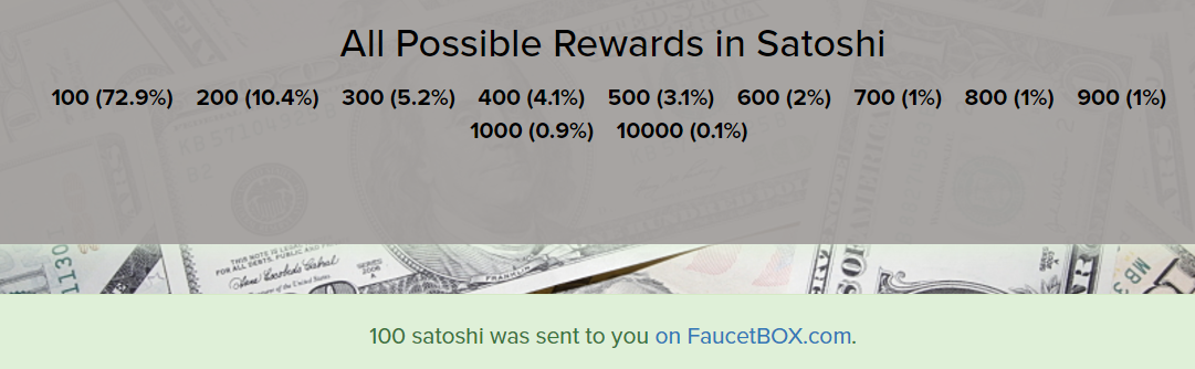 faucetbox.getfreebitcoin.de 100 (72.9%) 200 (10.4%) 300 (5.2%) 400 (4.1%) 500 (3.1%) 600 (2%) 700 (1%) 800 (1%) 900 (1%) 1000 (0.9%) 10000 (0.1%)