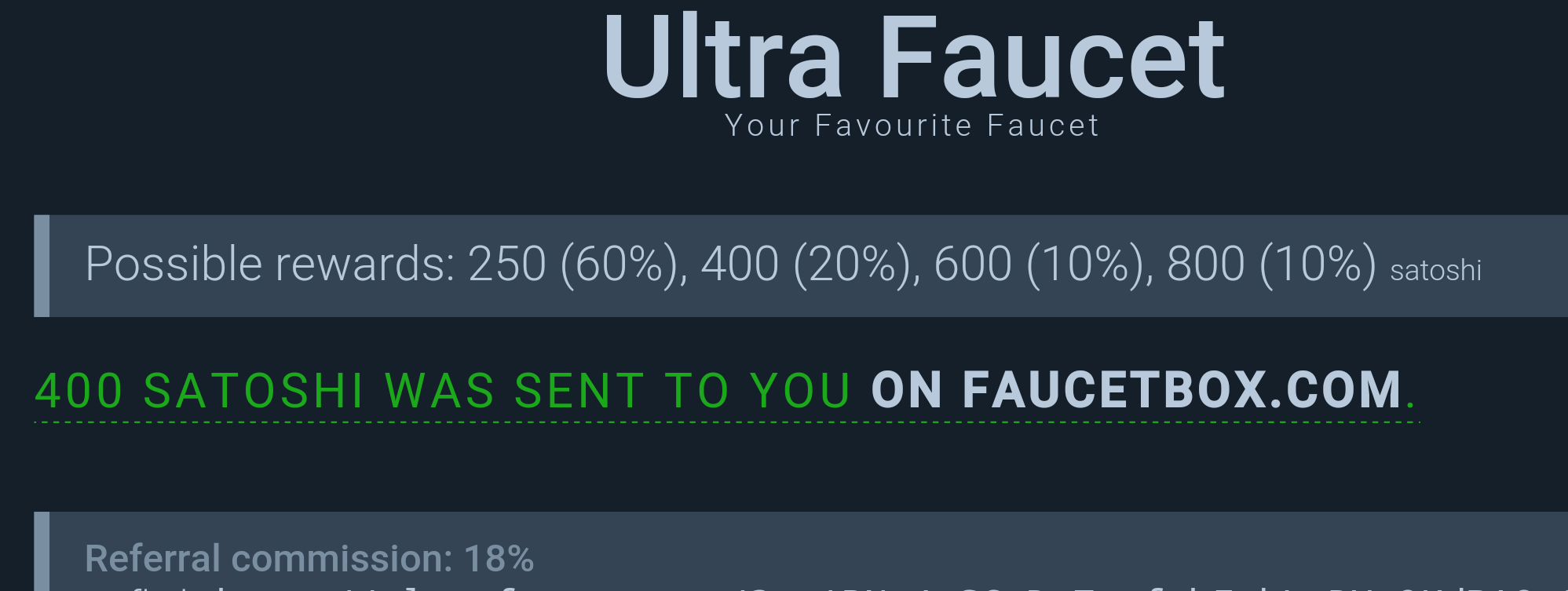 ultrafaucet.top - 250 (80%), 350 (10%), 400 (8%), 500 (2%) satoshi каждые 45 минут(не работает)