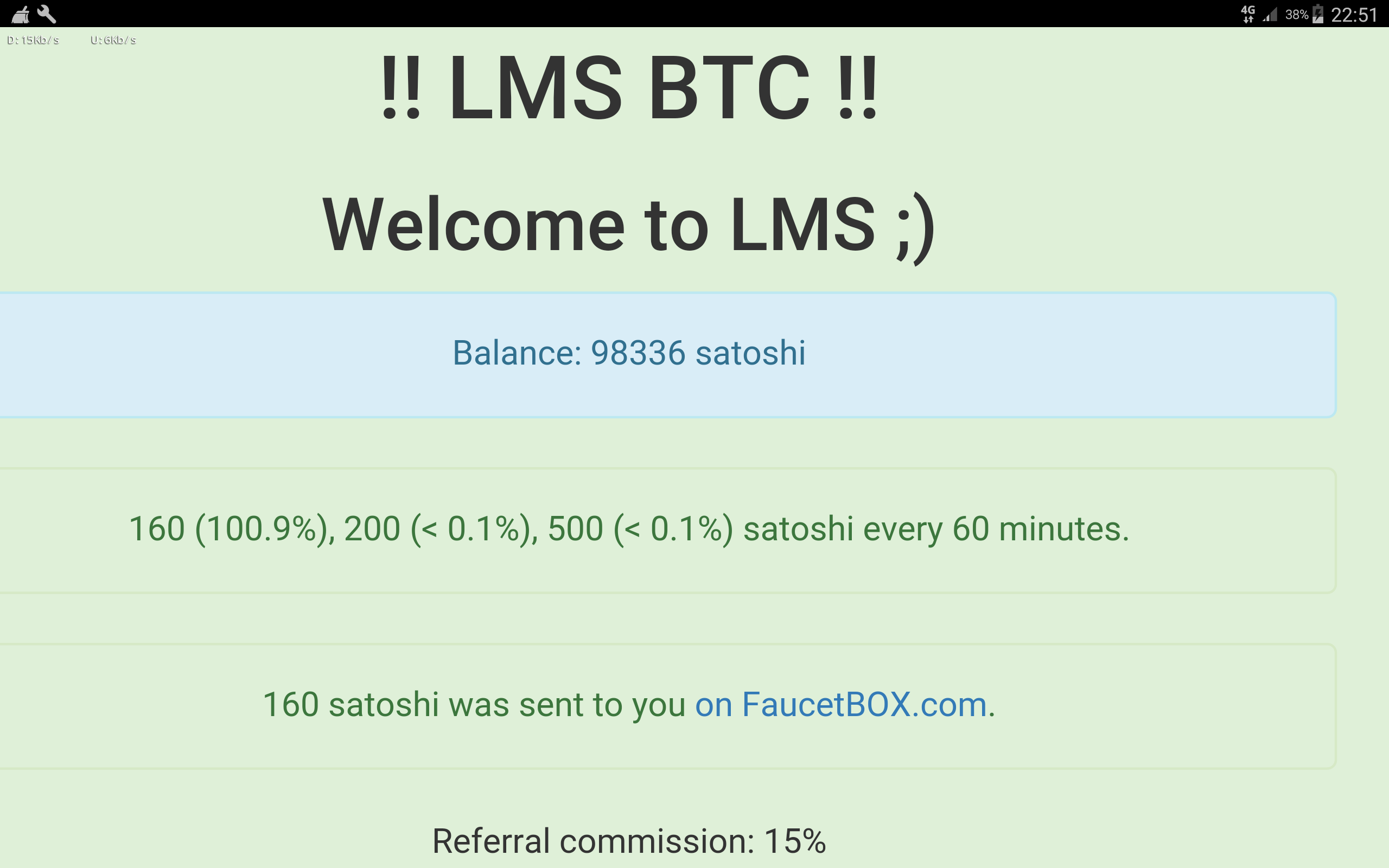 m7a5 Posted 27 Sep 2016, 19:53 Posted 27 Sep 2016, 19:53 (edited) Теперь 30 (100.9%), 50 (< 0.1%), 100 (< 0.1%) satoshi every 60 minutes. К сожалению в последнее время это тенденция. LMS BTC 160 satoshi 2016-09-27 22:49:45 MSK http://lmsfaucet.com/?r=1PNc4rSGoDgZznfzbFwkLgRXq2KdBAQr8q Edited 27 Sep 2016, 20:40 by m7a5