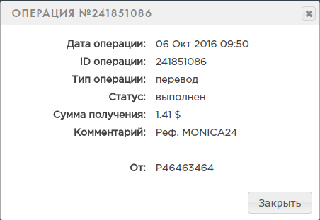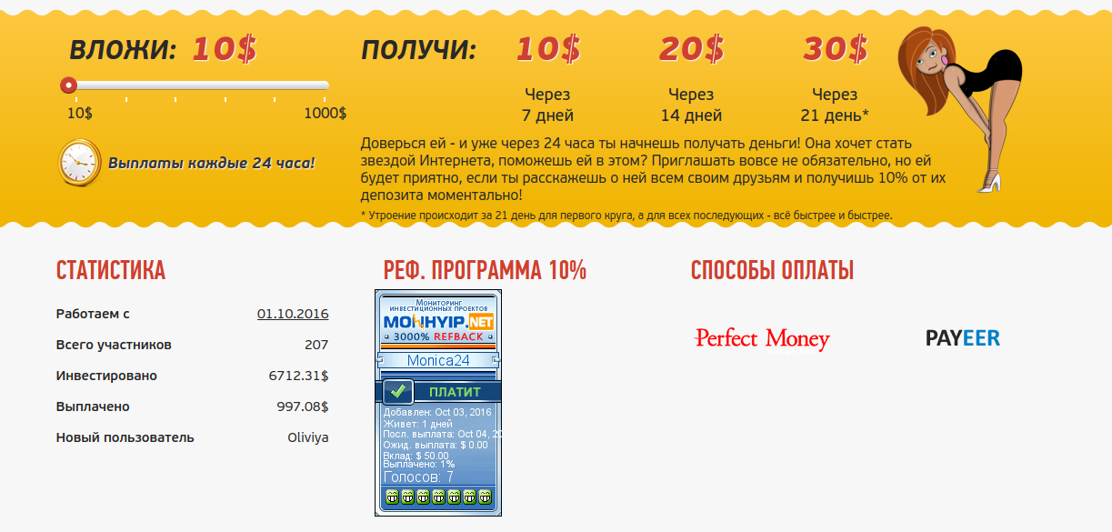Анжи Posted 4 Oct 2016, 17:13 Posted 4 Oct 2016, 17:13 Я НЕ АДМИН / ВЛАДЕЛЕЦ Старт проекта: 01.10.16 Доверься ей - и уже через 24 часа ты начнешь получать деньги! Она хочет стать звездой Интернета, поможешь ей в этом? Приглашать вовсе не обязательно, но ей будет приятно, если ты расскажешь о ней всем своим друзьям и получишь 10% от их депозита моментально! Маркетинг 14.28% в сутки на 21 день Регистрация http://monica24.com/?ref=21 Мин.ввод 10$ Мин на вывод 1 USD. Реф.программа 10%Платёжные системы: Perfect Money, Payeer,QIWI(скоро появится)ЕСТЬ СКАЙП-ЧАТ 1й Вывод с Моники по депу