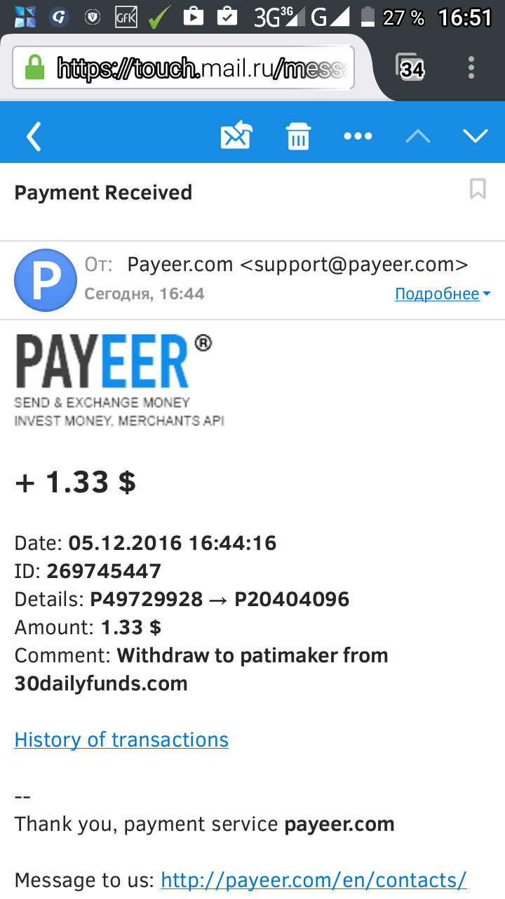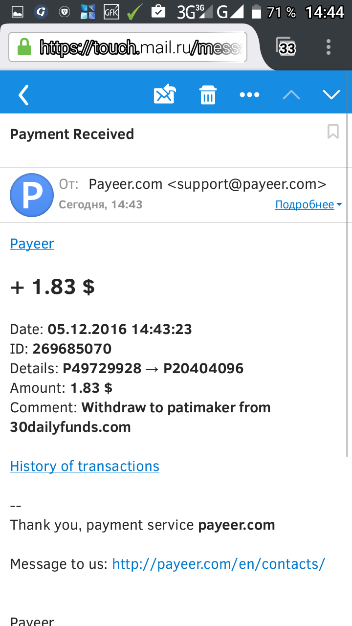 Balandas Posted 5 Dec 2016, 14:12 Author Posted 5 Dec 2016, 14:12 + 1.33 $ Date: 05.12.2016 16:44:16 ID: 269745447 Details: P49729928 → P20404096 Amount: 1.33 $ Comment: Withdraw to patimaker from 30dailyfunds.com Дата операции: 05 Дек 2016 17:05 ID операции: 269757174 Тип операции: перевод Статус: выполнен Сумма получения: 1.33 $ Комментарий: Withdraw to bojikobi4 from 30dailyfunds.com От: P49729928 отправил )))
