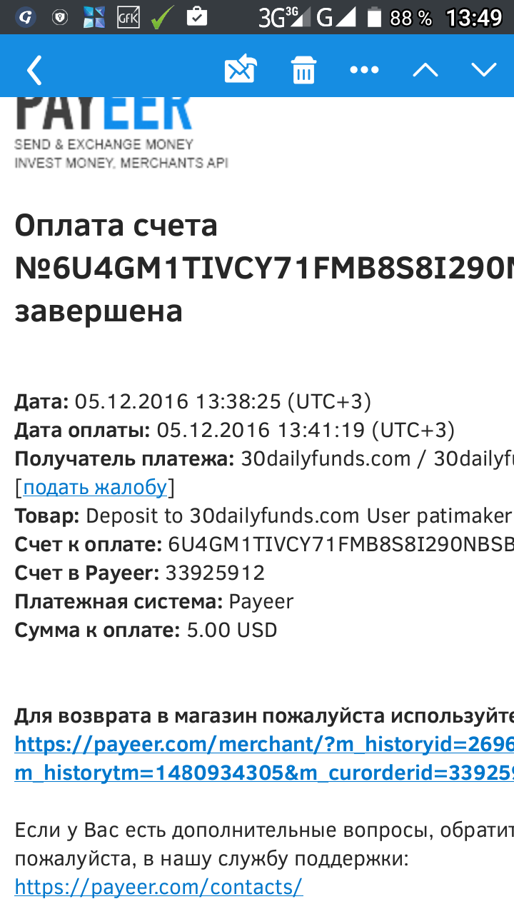 BOJIKOBI4 Posted 5 Dec 2016, 11:05 Posted 5 Dec 2016, 11:05 Дата операции: 05 Дек 2016 14:04 ID операции: 269665806 Тип операции: перевод Магазин: 30dailyfunds.com Статус: выполнен Сумма списания: 5.00 $ Сумма получения: 5.00 $ Номер счета в магазине: CXJ9I0JEJKZB10UPAKIF7MXWO37JEJUH