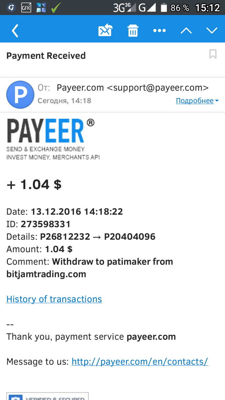 nvmagina Posted 15 Dec 2016, 10:13 Posted 15 Dec 2016, 10:13 (edited) PAYEER в пендинге Да, плохо.... В дальнейшем воздержусь от вклада на PerfectMoney только что получила инстантом $0.13 has been successfully sent to your PerfectMoney account U1619826. Transaction batch is 157182434. bitjamtrading.com Edited 15 Dec 2016, 10:16 by nvmagina