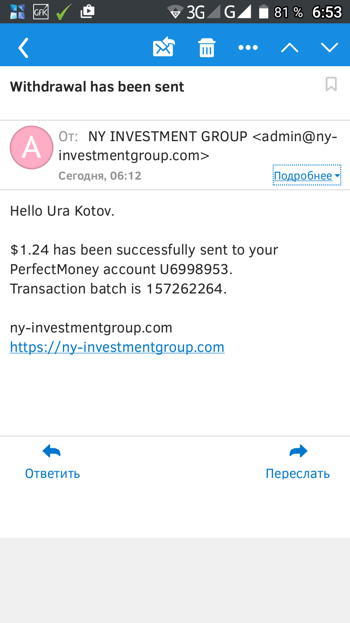 Balandas Posted 15 Dec 2016, 14:38 Author Posted 15 Dec 2016, 14:38 $0.45 has been successfully sent to your PerfectMoney account U6998953.Transaction batch is 157208967.ny-investmentgroup.comhttps://ny-investmentgroup.com