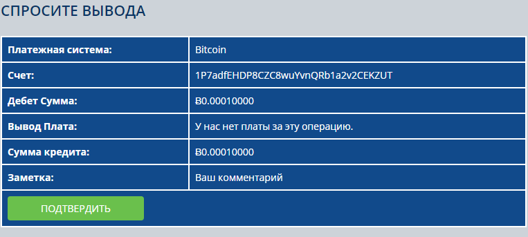 Olalala Posted 9 Jan 2017, 08:51 Author Posted 9 Jan 2017, 08:51 Сделала пробный вывод средств, всё норм! $0.00010000 has been successfully sent to your Bitcoin account 1P7adfEHDP8CZC8wuYvnQRb1a2v2CEKZUT.Transaction batch is e7f5a7be0df45345225a9468d6ff8ce090414434976c1468721ecbc61f6de23d.