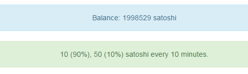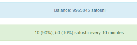 bestiya Posted 17 Jan 2017, 18:24 Author Posted 17 Jan 2017, 18:24 изменился план вознаграждений 10 (90%), 50 (9%), 100 (1%) satoshi every 10 minutes. 10 satoshi was sent to you