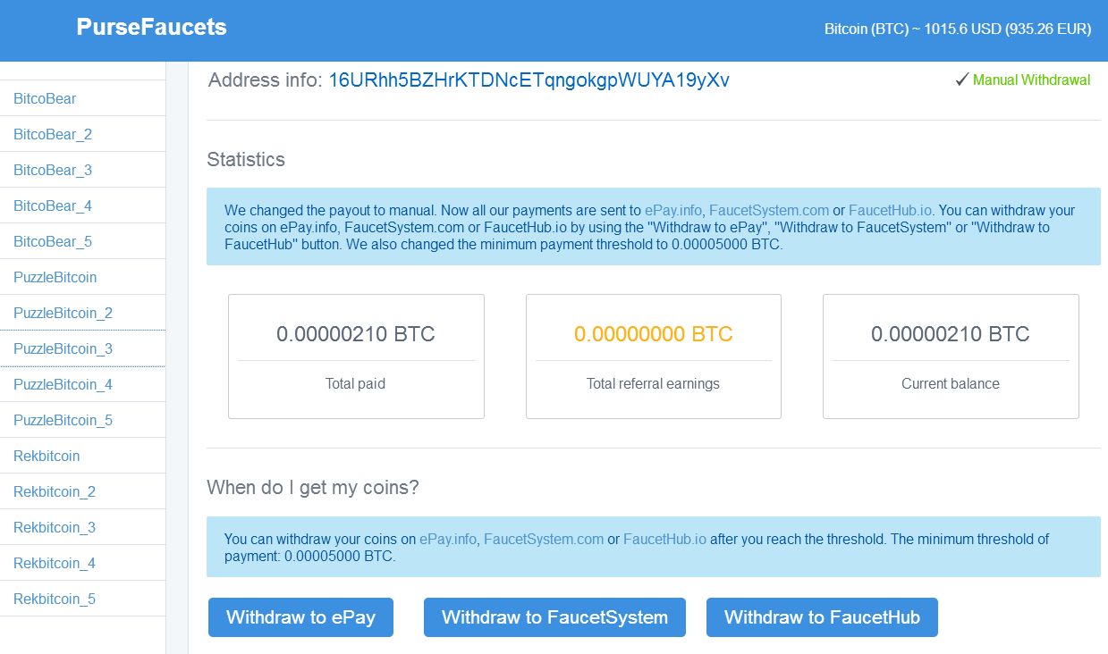 varley Posted 29 Mar 2017, 04:31 Posted 29 Mar 2017, 04:31 puzzlebitco.in 30 - 100 - 250 сатоши каждые 10 минут PurseFaucets - это промежуточный микрокошелёк, с которого можно переводить на: EPAY, FAUCETBUB, FaucetSistem Минималка на вывод: 5000 сатоши PurseFaucets имеет 15 кранов, которые быстро проходятся. реф-ка: 40% Ссылка: http://puzzlebitco.in/?r=16URhh5BZHrKTDNcETqngokgpWUYA19yXv