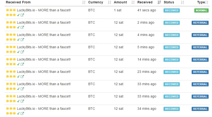 vlad17 Posted 4 Mar 2018, 06:23 Author Posted 4 Mar 2018, 06:23 LuckyBits.io - LTC Unlimited earnings✔ LTC 731 sat 50 secs ago RECEIVED NORMAL LuckyBits.io - DOGE Unlimited earnings✔ DOGE 31000000 sat 1 min ago RECEIVED NORMAL LuckyBits.io - BTC Unlimited earnings✔ BTC 30 sat 2 mins ago RECEIVED NORMAL