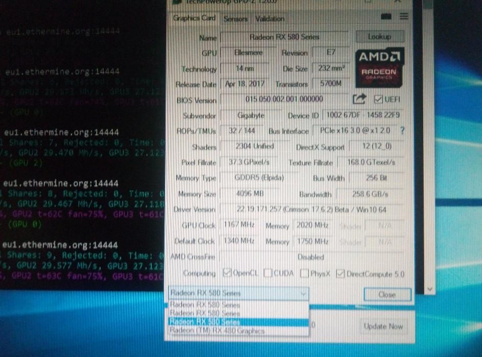 3 карты Gigabyte rx580 4gb. 1 карта Asus Dual rx480 4gb. Мать MSI  970a-g43 plus. Питание 2 шт. Aerocool VX-700 700W