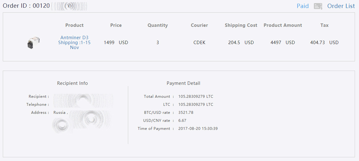 [ALL/Россия, Калининград] Аккаунт с оплаченным ордером на 3шт. Antminer D3 (Доставка в РФ)