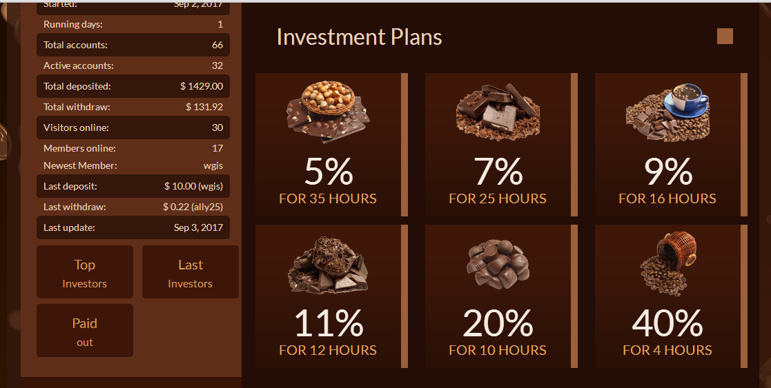 Balandas Posted 3 Sep 2017, 15:27 Posted 3 Sep 2017, 15:27 (edited) Welcome to Choco Exchange! Our company www.chocoexchange.trade helps you to get an incredible high return on your investments. If you don't like to waste time and if you want to earn big money easy - this program is for you. To participate in our program you need only one thing. All you need is desire to get rich. Our professional financial team and financial advisers are always at your service. We will help you to earn easy way. You can deposit any amount of money at any moment, and we have no withdrawal minimum. You can get your profit at any moment. And remember - the more you deposit, the more you earn. We have highly profitable investment plans, and you can just choose the more interesting for you. You will be surprised how many people work for our company. And you can earn a huge sum of money without any efforts. Simply deposit money and wait. All the rest will be made by our experts. They are engaged in it for all life, and we can give you guarantees that you won't risk your money. To start work with us and to do profitable investments you must read the company rules and make a deposit. Start earning money today and make your life much better with www.chocoexchange.trade! Investment Plans 5% FOR 35 HOURS 7% FOR 25 HOURS 9% FOR 16 HOURS 11% FOR 12 HOURS 20% FOR 10 HOURS 40% FOR 4 HOURS Affiliate Program www.chocoexchange.trade offers to its members a very attractive and lucrative referral commission of 3%, for every single deposit that your referral makes from his e-currency account. Therefore, promoting and advertising www.chocoexchange.trade everywhere is highly recommended, as you can make a lot of money from the 3% referral commissions! Депозит Deposit$ 10.00 Sep-3-2017 03:01Р:09 PM For this period:$ 10.00Total:$ 10.0010.00 Регистрация https://www.chocoexchange.trade/?ref=wgis Edited 3 Sep 2017, 16:49 by BALANDAS