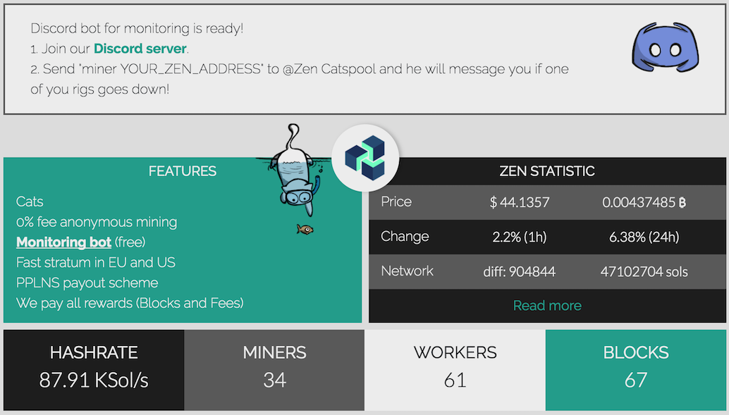 Ктд Posted 29 Jan 2018, 23:33 Author Posted 29 Jan 2018, 23:33 Новый раунд начался. 0% комиссия. http://zen.catspool.org/ Теперь у пула есть дискорд бот для мониторинга ригов, который скажет когда ваш воркер упал. Заходите к нам в дискорд: https://discordapp.com/invite/wvWr8kG и посмотрите прикрепленные сообщения.
