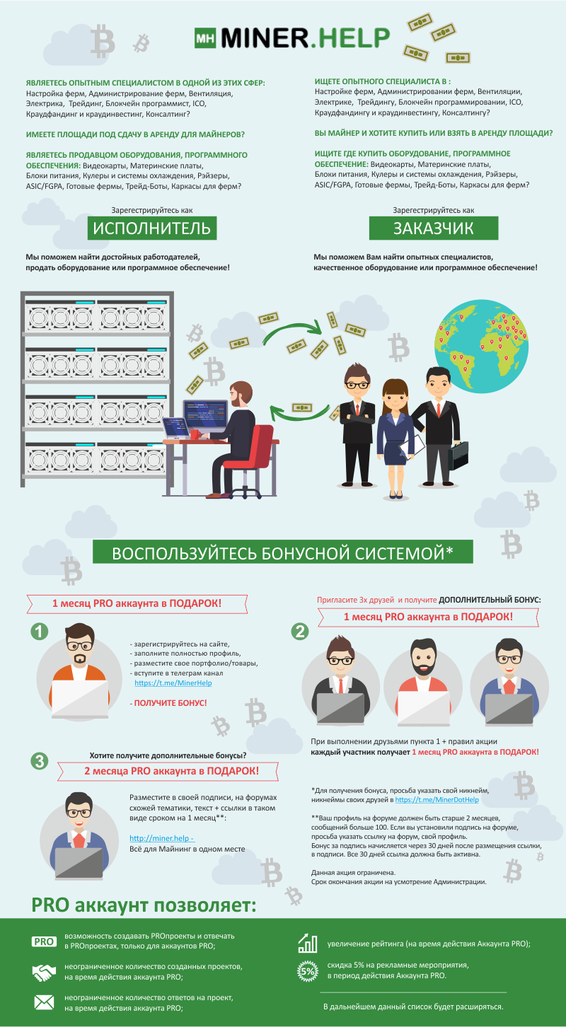granddad Posted 16 Oct 2017, 14:32 Posted 16 Oct 2017, 14:32 (edited) Добрый день! Коллеги по майнингу и прочему, родилась у нас идея, что нет на данный момент такого узкоспециализированного сайта на просторах РУ интернета, где мы могли бы искать заказчиков и исполнителей по разной майнинговой тематики. Решили на добрых началах сделать сайт http://www.miner.help , смесь фриланса и авито. Ровно до 01.01.2018 будет действовать акция, по получению БЕСПЛАТНО PROаккаунта. Будем рады выслушать любые ваши комментарии. Немного информации о будущем: ведется разработка безопасных сделок на портале включающая в себе арбитраж (как на алиэкспресс/ebay), переводов между пользователями, система комментариев. Edited 20 Oct 2017, 10:12 by granddad 1