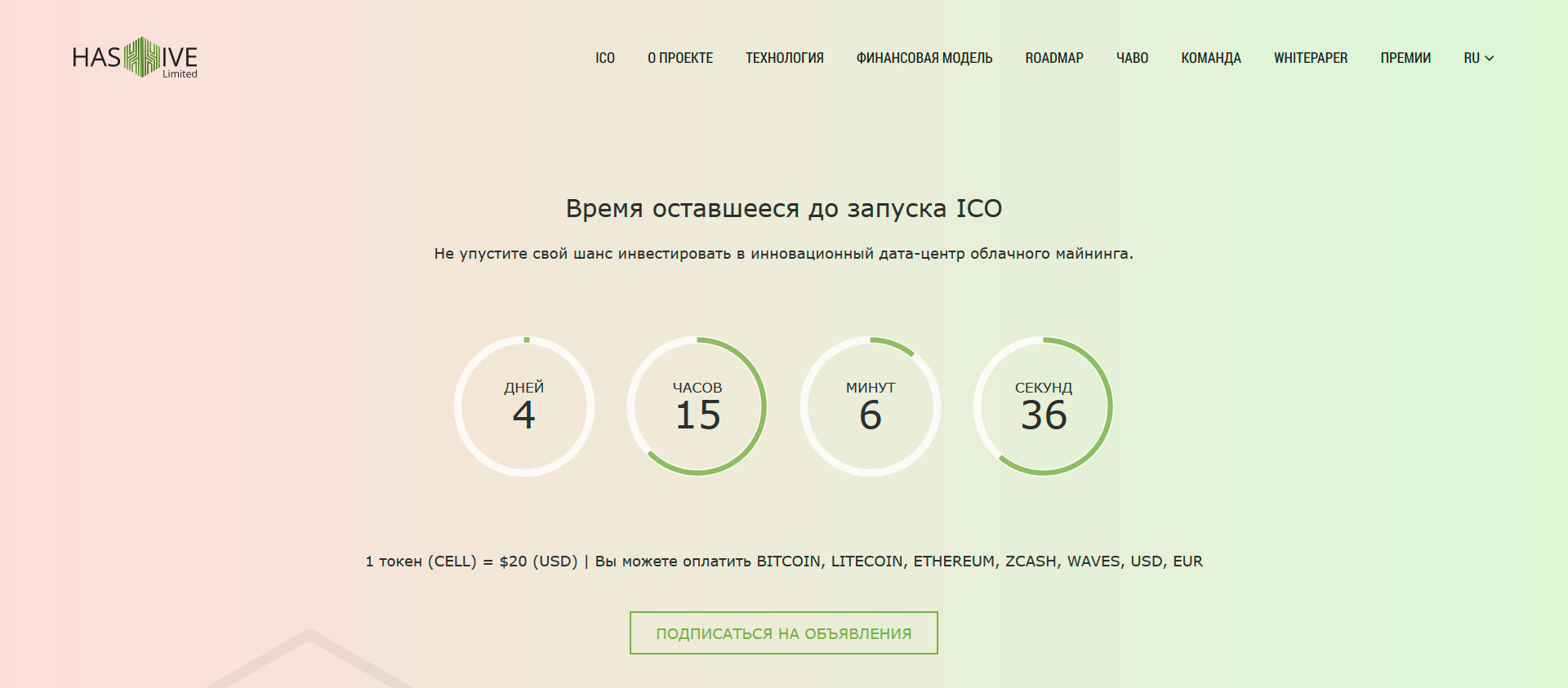 HashHive в рамках проводимого ICO планирует привлечь инвестиции на сумму до 30 миллионов долларов. Токен проекта – CELL, представляет собой эквивалент hash-мощности. Его цена составляет 20$, а эквивалент — 1 MH/s (DaggerHashimoto). В качестве оплаты будут приниматься Bitcoin, Litecoin, Ethereum, ZCash, Waves, а также доллары и евро. Всего будет выпущено 2 167 000 токенов, из которых 1 500 000 токенов CELL будут представлены для продажи на ICO.