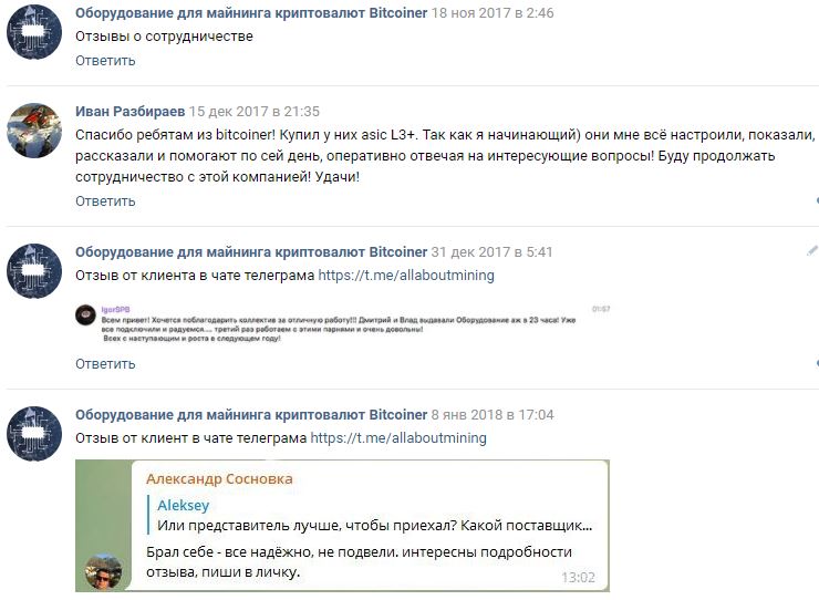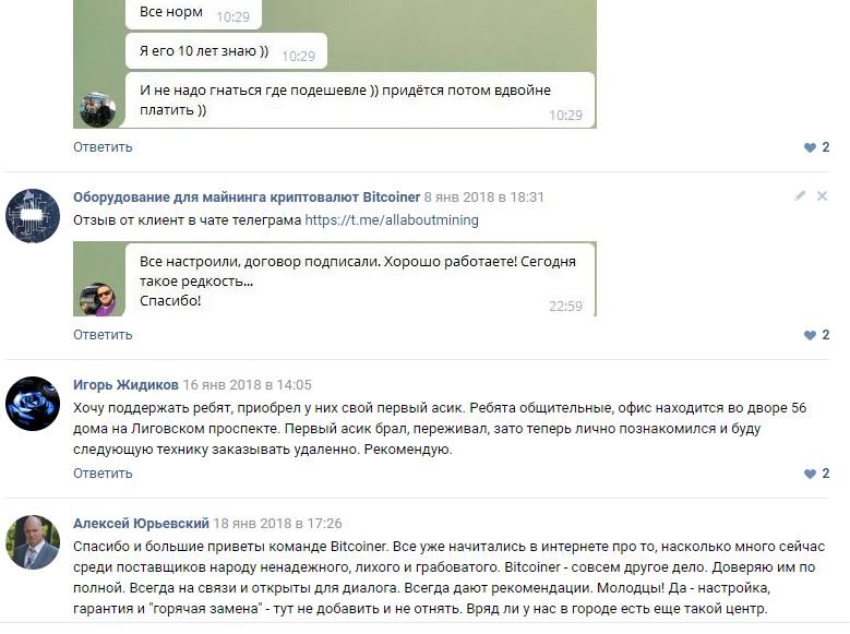Oleg Izmakin Posted 21 Jan 2018, 12:48 Posted 21 Jan 2018, 12:48 Здравствуйте! Скриншоты отзывов по нам приложил. Также мы есть на каналах ниже, добавляйтесь к нам: 1) Telegram канал с ценами и обзорами на железо @spbbitcoiner 2) чат в Telegram по теме майнинга и крипты @allaboutmining 3) группа в VKontakte https://vk.com/oborudovanie_dlya_maininga 4) группа в Facebook https://goo.gl/RzyDdz 5) наш сайт http://spb-bitcoiner.ru/ С пожеланием высокопрофитного майнинга, Олег Измакин, компания Биткойнер 8-982-934-59-69