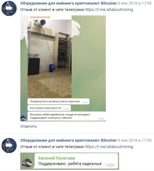 VladBitcoiner Posted 18 Jan 2018, 12:02 Author Posted 18 Jan 2018, 12:02 @Grach Отзывы вы можете посмотреть в группе vk https://vk.com/topic-147470176_35813539 так же можете пообщаться с людьми, которые уже покупали https://t.me/allaboutmining