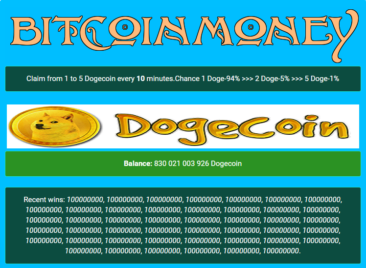 MonteUa Posted 6 Dec 2017, 09:53 Posted 6 Dec 2017, 09:53 Claim from 1 to 5 Dogecoin every 10 minutes.Chance 1 Doge-94% >>> 2 Doge-5% >>> 5 Doge-1% 1-5 DOGE 10 min FaucetHub http://bitcoinmoney.info/