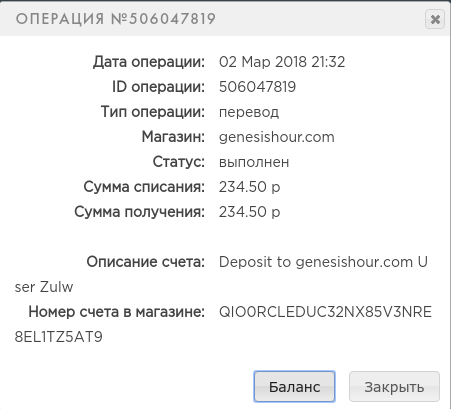 BOJIKOBI4 Posted 2 Mar 2018, 18:06 Author Posted 2 Mar 2018, 18:06 + 0.47 USD Date: 02.03.2018 20:58:00ID: 506019911Details: P89892610 → P24272615Amount: 0.47 USDComment: Withdraw to bojikobi4 from genesishour.com